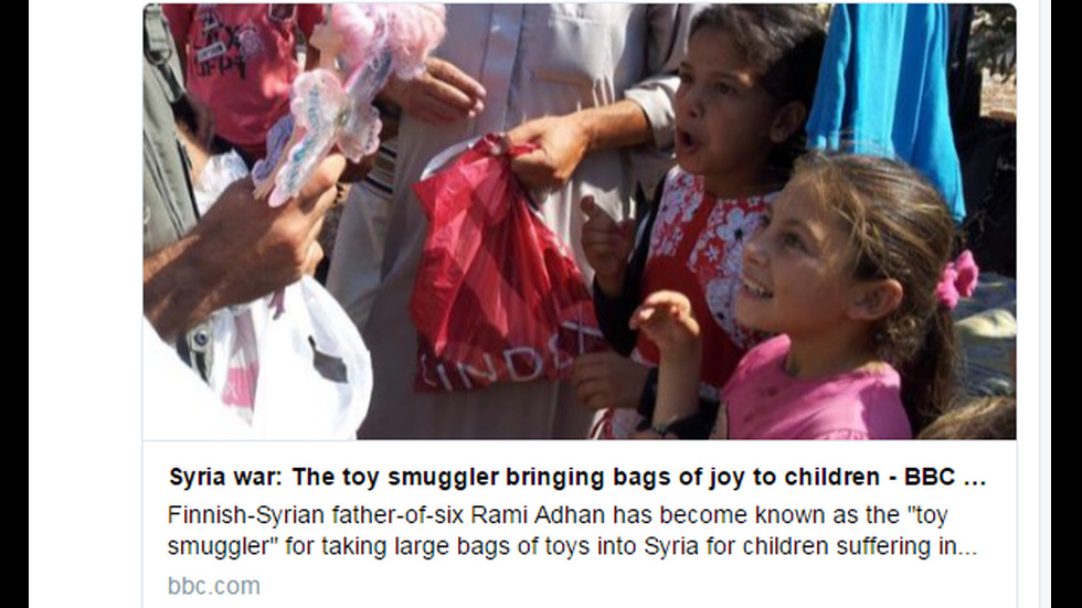 ГАЛЕРИИ Мюсюлманският Дядо Коледа раздава играчки на децата в Сирия Снимки: Twitter 3 / 9 Мюсюлманският Дядо Коледа раздава играчки на децата в Сирия 28 септември 2016 09:54 Снимки: Twitter Tweet Още галерии България се сбогува с легендарния Борислав Михайлов Морето изхвърли крило на боен дрон на плаж в Бургаско Автобус помете патрулки на паркинга пред районното в Горна Оряховица Пътнически влак дерайлира в Старозагорско Рекордно количество прах от Сахара и кални дъждове парализираха остров Крит Седми лайв на "Като две капки вода" - Сезона-Слънце Най-популярните България се сбогува с легендарния Борислав Михайлов Пътнически влак дерайлира в Старозагорско Автобус помете патрулки на паркинга пред районното в Горна Оряховица Рекордно количество прах от Сахара и кални дъждове парализираха остров Крит Морето изхвърли крило на боен дрон на плаж в Бургаско
