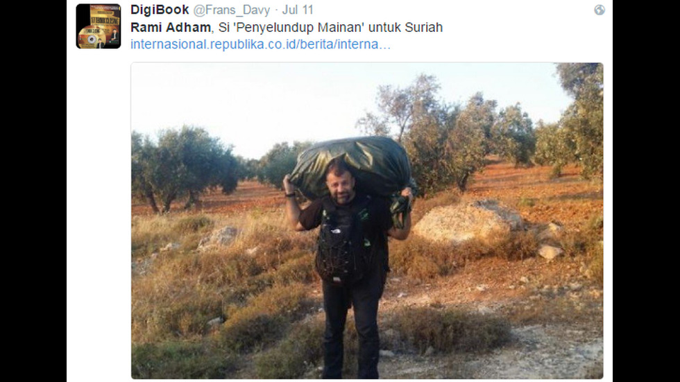 ГАЛЕРИИ Мюсюлманският Дядо Коледа раздава играчки на децата в Сирия Снимки: Twitter 8 / 9 Мюсюлманският Дядо Коледа раздава играчки на децата в Сирия 28 септември 2016 09:54 Снимки: Twitter Tweet Още галерии България се сбогува с легендарния Борислав Михайлов Морето изхвърли крило на боен дрон на плаж в Бургаско Автобус помете патрулки на паркинга пред районното в Горна Оряховица Пътнически влак дерайлира в Старозагорско Рекордно количество прах от Сахара и кални дъждове парализираха остров Крит Седми лайв на "Като две капки вода" - Сезона-Слънце Най-популярните България се сбогува с легендарния Борислав Михайлов Пътнически влак дерайлира в Старозагорско Автобус помете патрулки на паркинга пред районното в Горна Оряховица Рекордно количество прах от Сахара и кални дъждове парализираха остров Крит Морето изхвърли крило на боен дрон на плаж в Бургаско