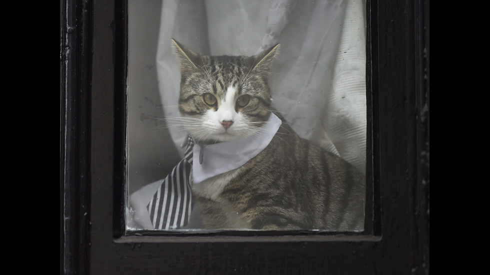 Котката на основателя на Уикилийкс Джулиан Асанж се появи с вратовръзка в цветовете на дъгата. Сменя ги по различни поводи. Снимки: ЕРА/БГНЕС