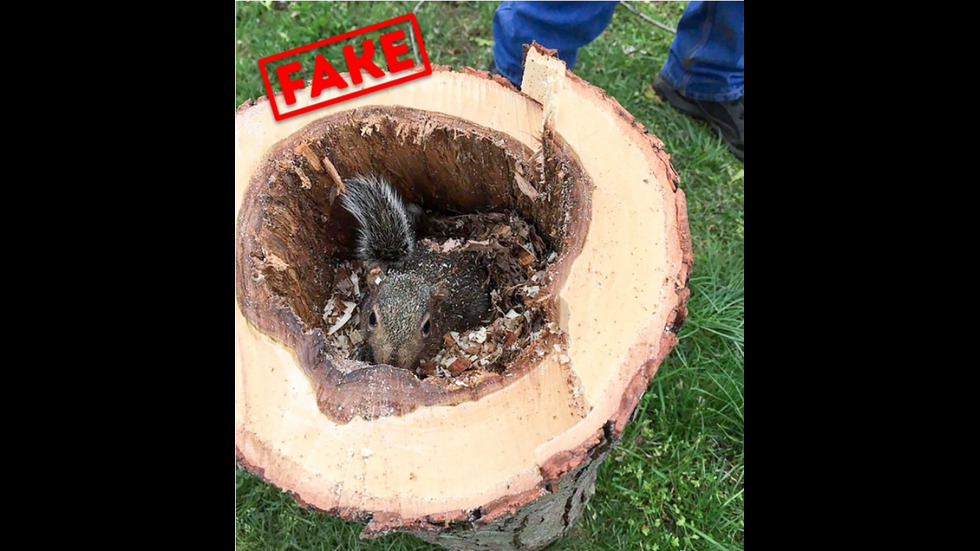 Катеричката, която се е сгушила в остатъците от отсечено дърво. Трогателна гледка. Но ако се вгледате по-внимателно, ще видите, че тя е поставена там насила. На първо място, катериците правят хралупите си на 4-6 метра над земята. Oсвен това, върху тревата и около самото животинче няма стърготини. А това на снимката изобщо не е издълбан пън, а по-скоро загнило дърво.