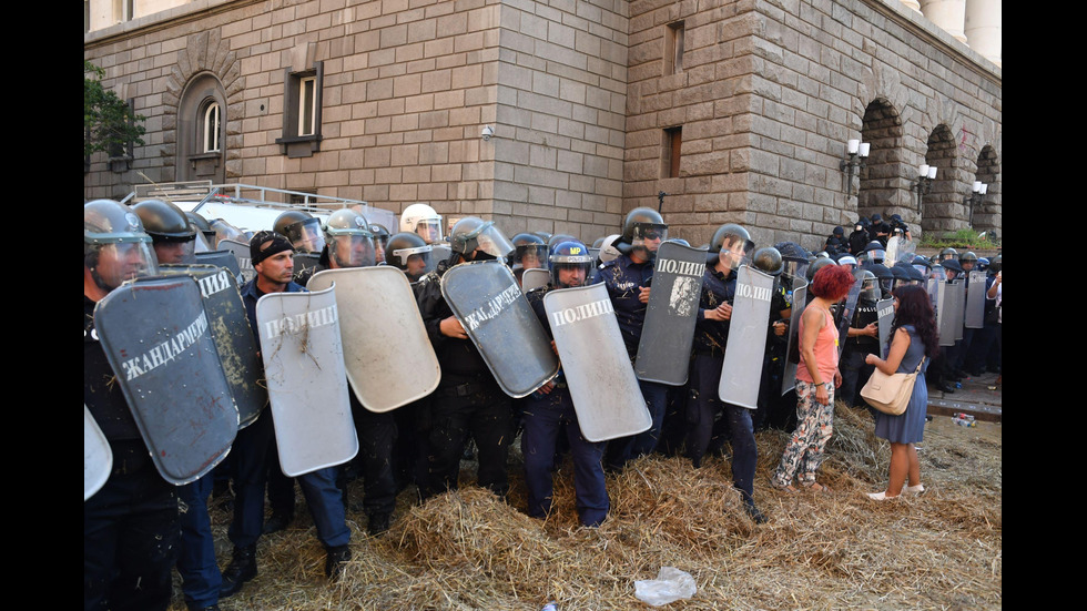 Демонстранти замеряха полицията със сено в Триъгълника на властта