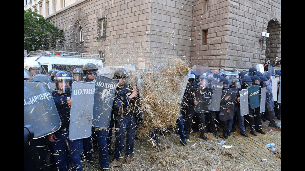 Демонстранти замеряха полицията със сено в Триъгълника на властта
