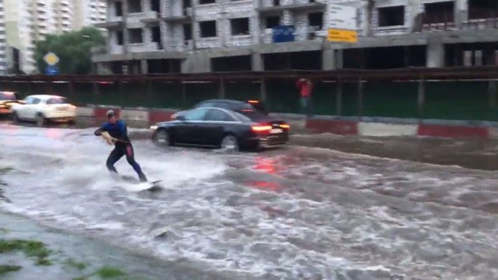 Най-силните дъждове от 100 години насам наводниха улиците в Москва. Бедствието обаче беше прието на шега от младите московчани, някои от които се качиха на уейкбордовете си.