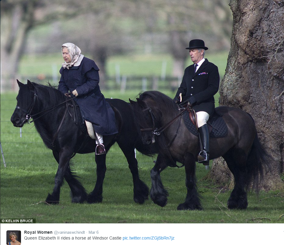 Тя е била забелязана край замъка от очевидци, които останали изненади, защото кралицата е на 90-години. Била е съпроводена от главния коняр на замъка Тери Пендри, който също яздел малко зад нея. Британски медии твърдят, че въпреки възрастта си и прекараното боледуване наскоро Елизабет II изглеждала добре и напълно здрава.
