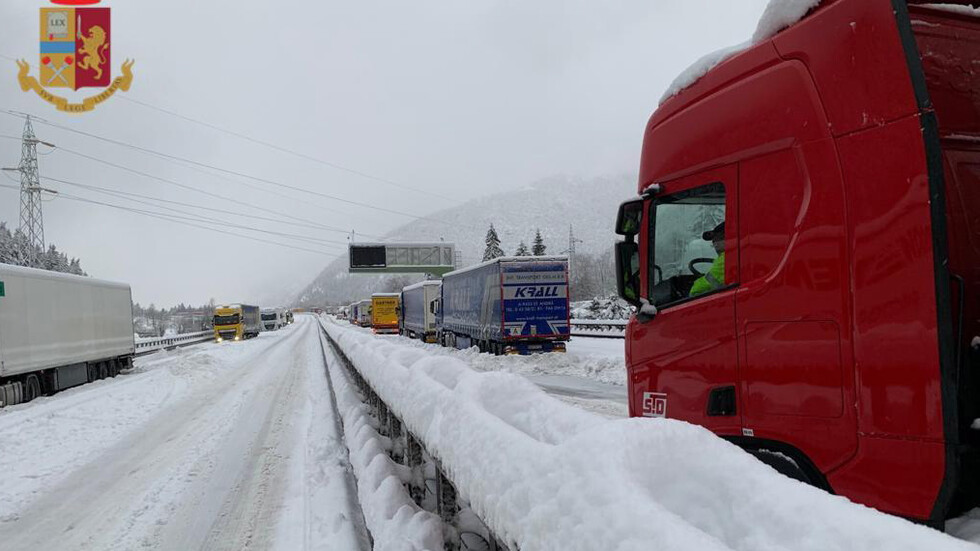 Капризите на времето създадоха проблеми в Италия. Снегът блокира хиляди коли и камиони на магистрала А22, водеща към Австрия. Опашката от леки коли, автобуси и тирове достигна 12 км.
