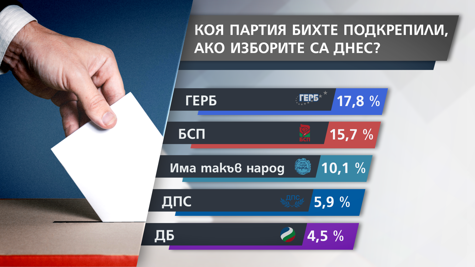 Според изследването на „Сова Харис”, ако изборите бяха днес, те щяха да бъдат спечелени от ГЕРБ със 17,8 %. БСП се нареждат втори с 15,7%. Следва партията на Слави Трифонов „Има такъв народ” с малко над 10%. А на четвърто и пето място са ДПС и „Демократична България”.