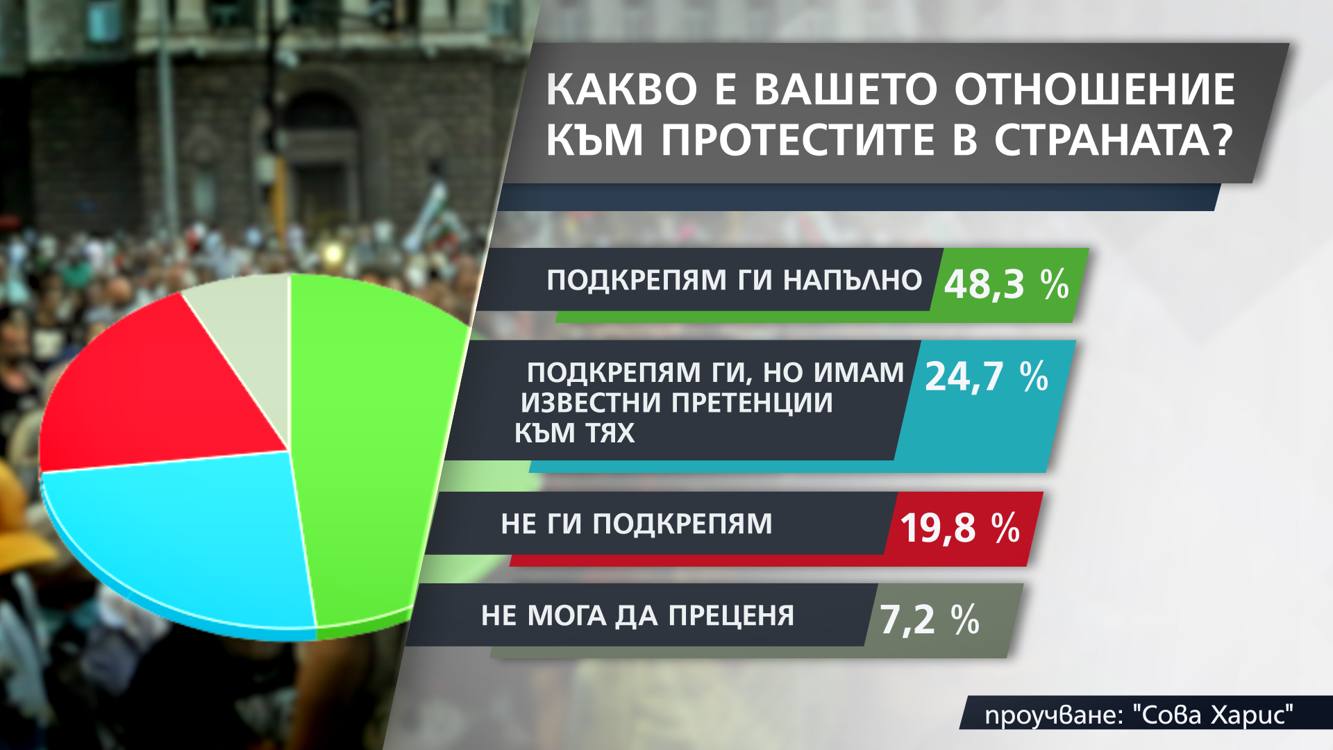 48% подкрепят напълно протестите, 25% подкрепят, но с претенции към тях. 19,8% не ги одобряват. А 7% са тези, които не могат да преценят. Това сочат данните на „Сова Харис”.