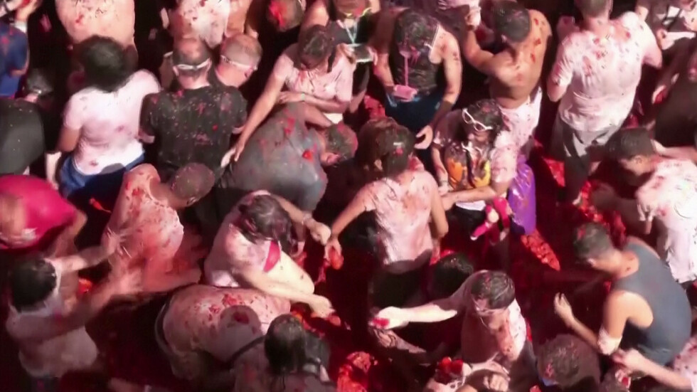 Повече от 20 000 души се замеряха с домати на „Ла Томатина“, един от най-известните фестивали в Испания, който се завърна след двугодишна пауза заради COVID ограниченията.