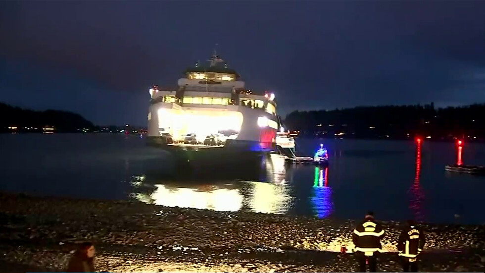 Ферибот с над 600 души на борда заседна в плитчини край Сиатъл. пасажерите се оказаха блокирани на борда с часове. Бяха раздадени спасителни жилетки. На вода бяха спуснати и саловете за аварийни ситуации. Властите съобщават за един пътник с медицински проблем.
