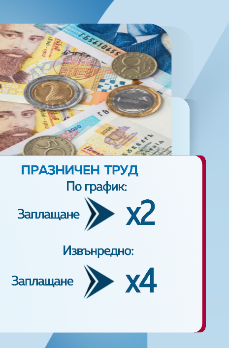 Втората хипотеза е, че се наложи в празничен ден да бъдем извикани извънредно на работа. Тогава вече заплащането трябва да е четворно.