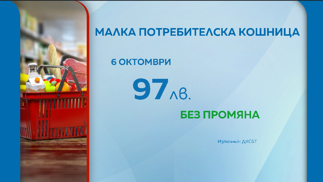 Без промяна остава потребителската кошница през изминалата седмица. Така тя запазва стойността си от 97 лева, отчетоха от Държавната комисия по стокови борси и тържища на редовния си брифинг.