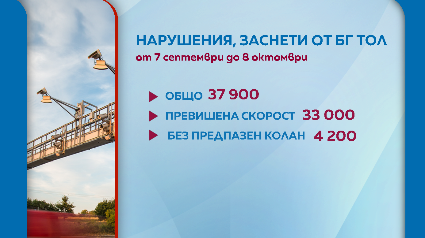 „В МВР са постъпили 37 900 файла, съдържащи заснети нарушения от камерите на Националното тол управление, за нарушения, установени по републиканската пътна мрежа. Над 33 000 са регистрираните нарушения на скоростните режими за средна скорост. Като най-сериозни превишения са отчетени по автомагистрала „Тракия” - превишения на скоростта, движение с над 200 км/ч, а в някои случаи дори над 220 км/ч”, обясни гл. инспектор Лъчезар Близнаков от "Пътна полиция", ГДНП.