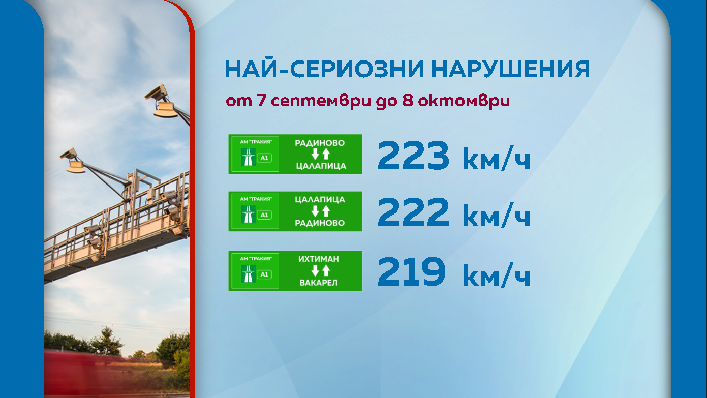 Най-сериозните превишения на скоростта, установени от БГ ТОЛ за периода, са както следва:
