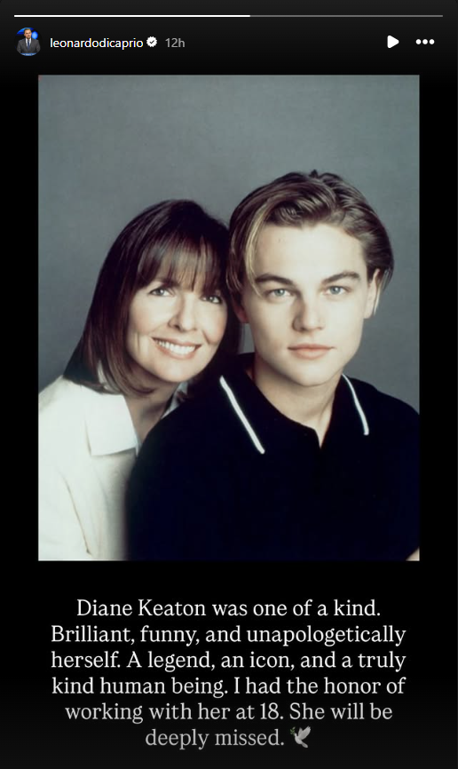 Леонардо ди Каприо, който изигра племенника на Кийтън в „ Стаята на Марвин“, публикува Instagram Stories. „Даян Кийтън беше единствена по рода си. Брилянтна, забавна и безрезервно себе си“, написа той, споделяйки обща снимка. „Легенда, икона и наистина мил човек. Имах честта да работя с нея на 18 години. Тя ще ни липсва много.“