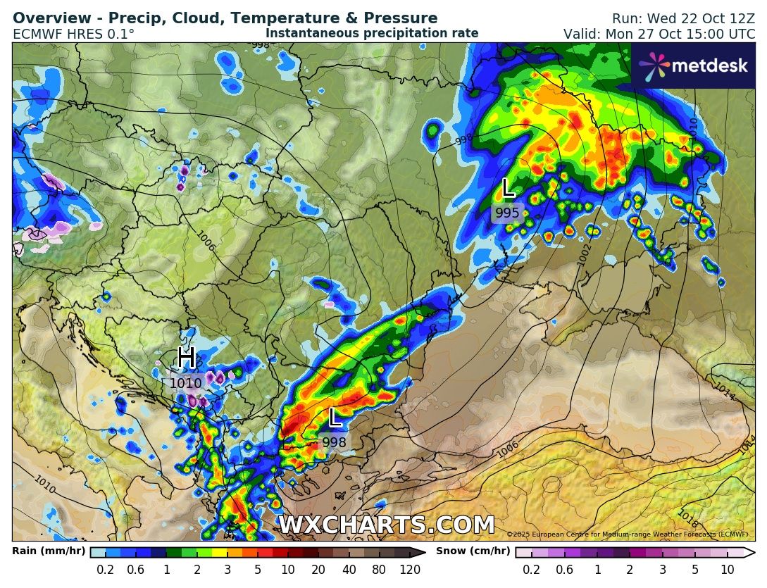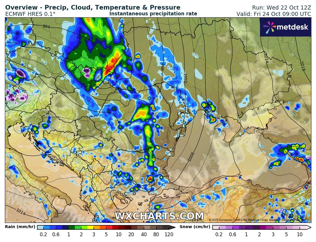 Промяна в обстановката очакваме в петък с преминаването на студен атмосферен фронт. Ще духа силен вятър с пориви от запад-северозапад със скорост до 70-80 километра в час. От запад на изток, в хода на деня, ще преминат валежи – кратки, но временно интензивни. Условията ще позволяват образуването на по-експлозивни гръмотевични бури с риск от градушка.