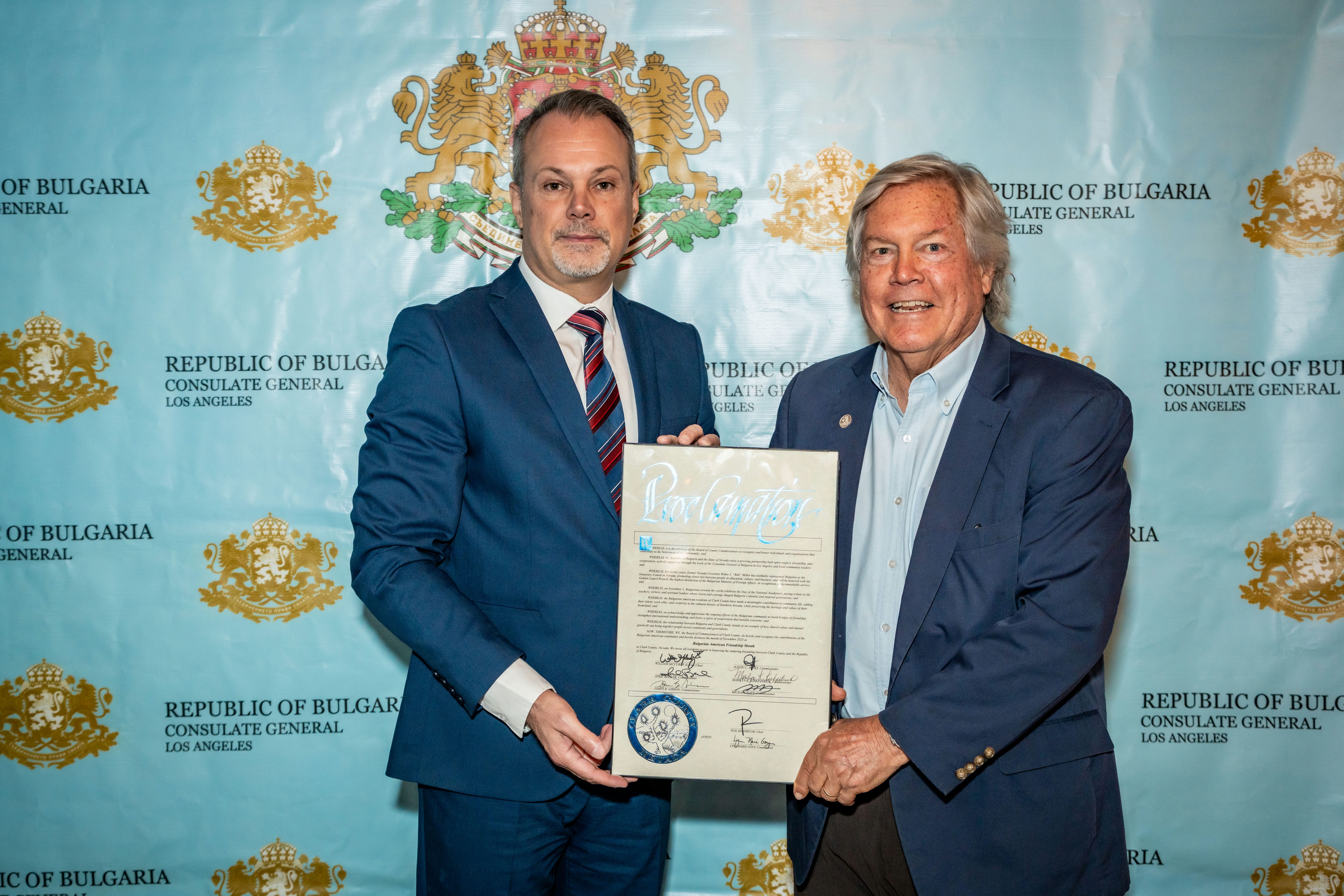 По инициатива на генералния консул Бойко Христов, по време на церемонията със специални прокламации, кметът на Лас Вегас, Шели Бъркли, и председателят на Борда на комисарите на Кларк Каунти, Тик Сигърблум, обявиха месец ноември 2025 г. за „Месец на българо-американското приятелство“ в Лас Вегас и Кларк Каунти.