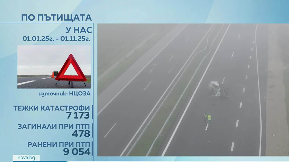 По данни на националната статистика, близо 500 души са загубили живота си при ПТП от началото на миналата година. А по данни на Националния център по обществено здраве и анализи, за последните 11 месеца по пътищата на страната ни са станали 7173 катастрофи, при които са били ранени малко над 9000 души.