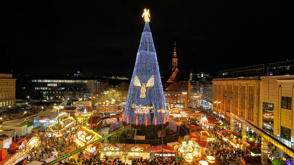 Светлините на най-високото коледно дърво в света бяха запалени в германския град Дортмунд.
