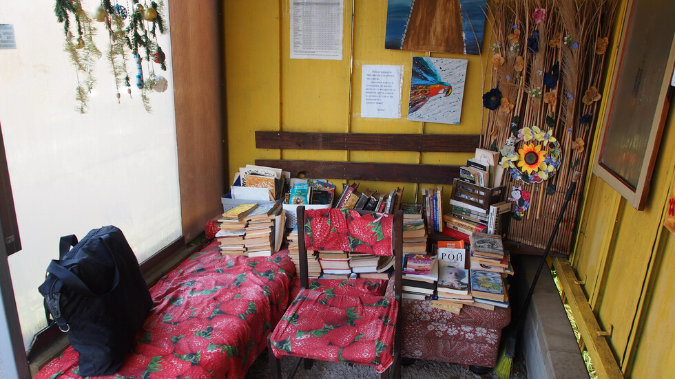 Мястото обаче впечатлява не само с практичността си. Вътре има картини, малка библиотека за свободен обмен на книги, а пространството около спирката е облагородено с градинка, засадена с дръвчета и декорирана с артистични инсталации от миди.