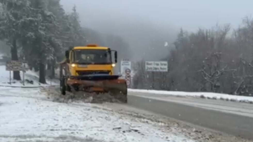 Сняг вали на прохода "Шипка". От събота вечерта снегорини почистват и опесъчават пътното платно.